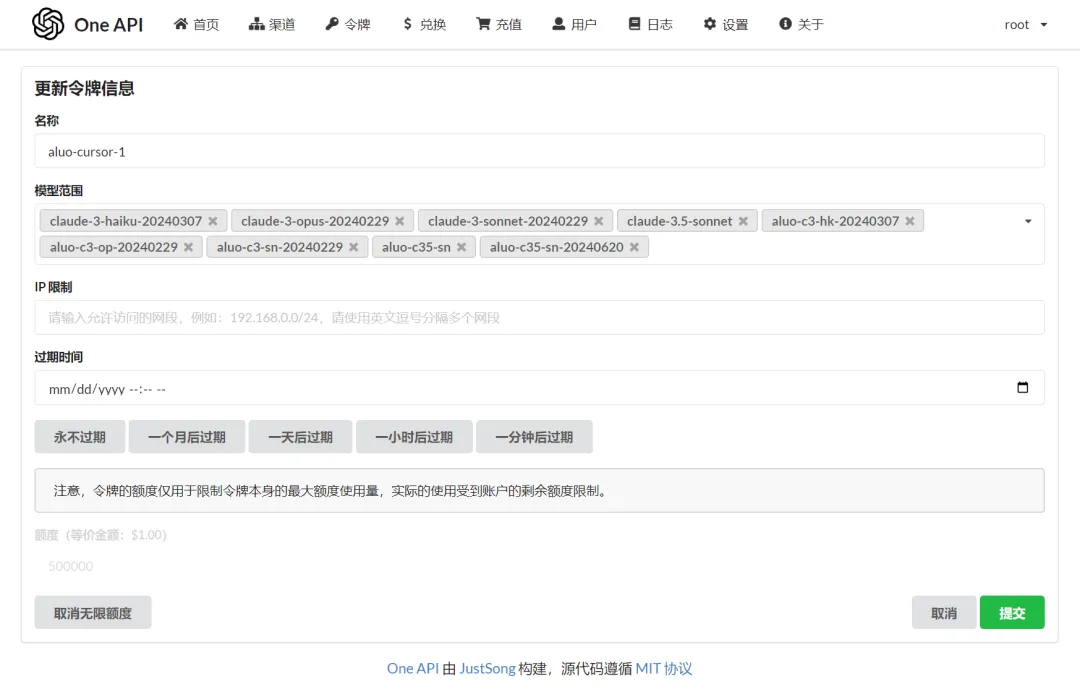 模型范围:选择刚创建的自定义模型名称,授权给这个令牌。
