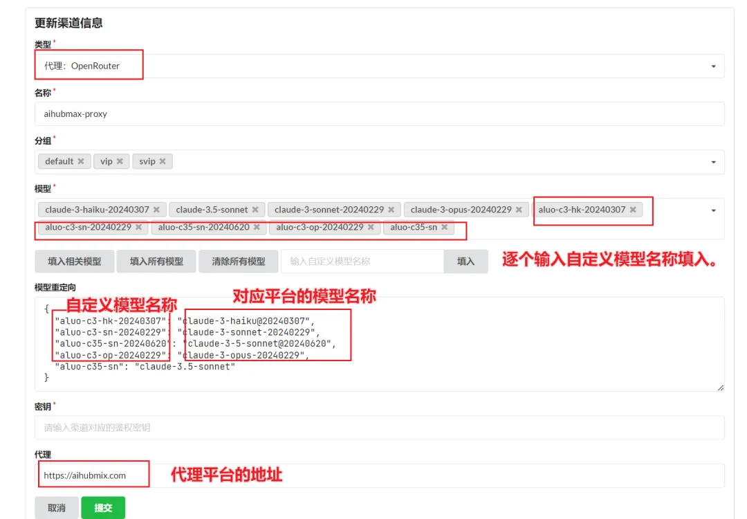 - 模型重定向: 自定义模型名称(避免使用含”Claude”的关键词)。这里自定义好自己的模型名称,需要跟平台的名称对应,注意自定义的名称不要带 Claude 那些模型的关键字,否则会被 cursor 拦截。