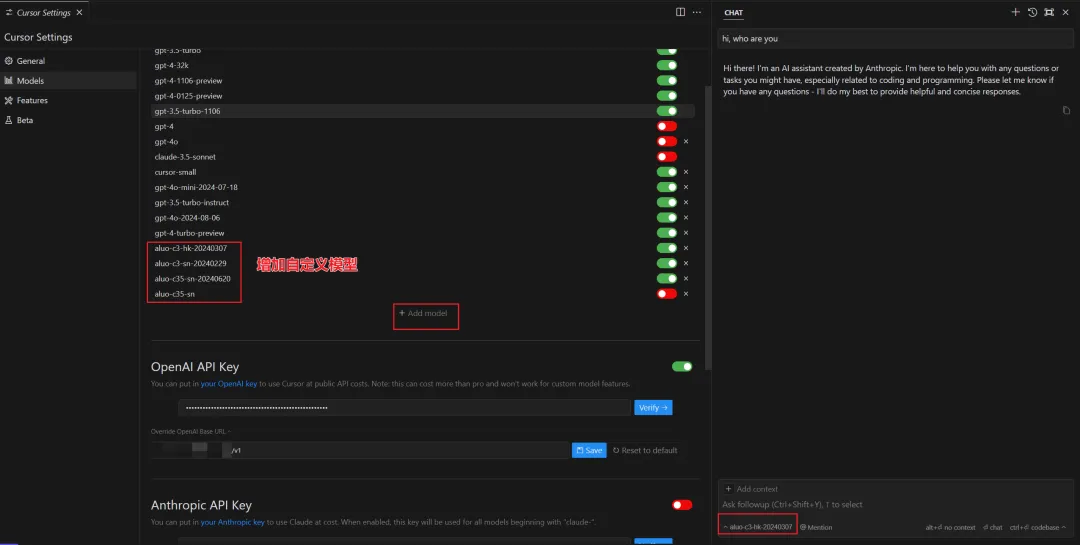 配置时请使用自定义模型名称,避免使用 Anthropic 原始模型名称,否则可能被 Cursor 拦截。