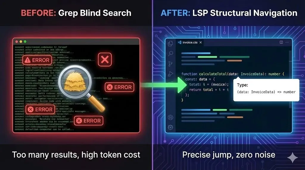 过去的工作流是”先grep,再过滤,再猜上下文”。重构一次,全局grep好几轮,又慢又烧Token。接入LSP后,走的是”结构化查询”路径: